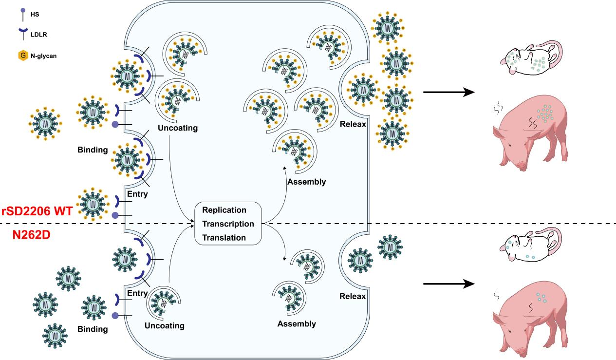 研究发现GETV中的E2-N262糖基化是一种进化适应性变化,它能促进病毒与受体结合、逃逸宿主免疫应答和增强病毒毒力。利用反向遗传学技术,构建了重组GETV病毒株——rSD2206WT和N262D突变体。体外实验中,rSD2206WT形成了更大的噬斑块,并在多种细胞系中更高效地复制。在小鼠和仔猪模型中,rSD2206WT表现出比N262D病毒更强的致病性和复制效率,引发了较弱的宿主抗病毒反应,但免疫原性保持不变。进一步研究发现rSD2206WT通过增强对HS(一种GETV附着因子)和LDLR(一种GETV受体)的结合亲和力,增加了病毒颗粒与宿主细胞的附着和进入。此外,rSD2206WT病毒株还能通过中断干扰素调节因子3的激活来逃避宿主的抗病毒反应。结构分析显示,rSD2206WT的结合自由能显著降低,这种降低导致了E2蛋白内部的构象变化,进而增强了其稳定性,并随之提高了其与受体的结合能力。与N262D相比,rSD2206WT在过表达LDLR的细胞中表现出更强的复制能力,但在LDLR-/-小鼠中复制能力则显著降低。